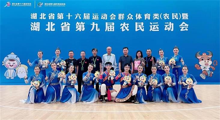 熱烈祝賀謝芳同志(照片中第一排從左到右第三位)在湖北省第十六屆運(yùn)動(dòng)會(huì)群眾類(農(nóng)民)健身操團(tuán)體比賽中獲得一枚金牌,四枚銀牌,團(tuán)體總分第一的優(yōu)異成績。
