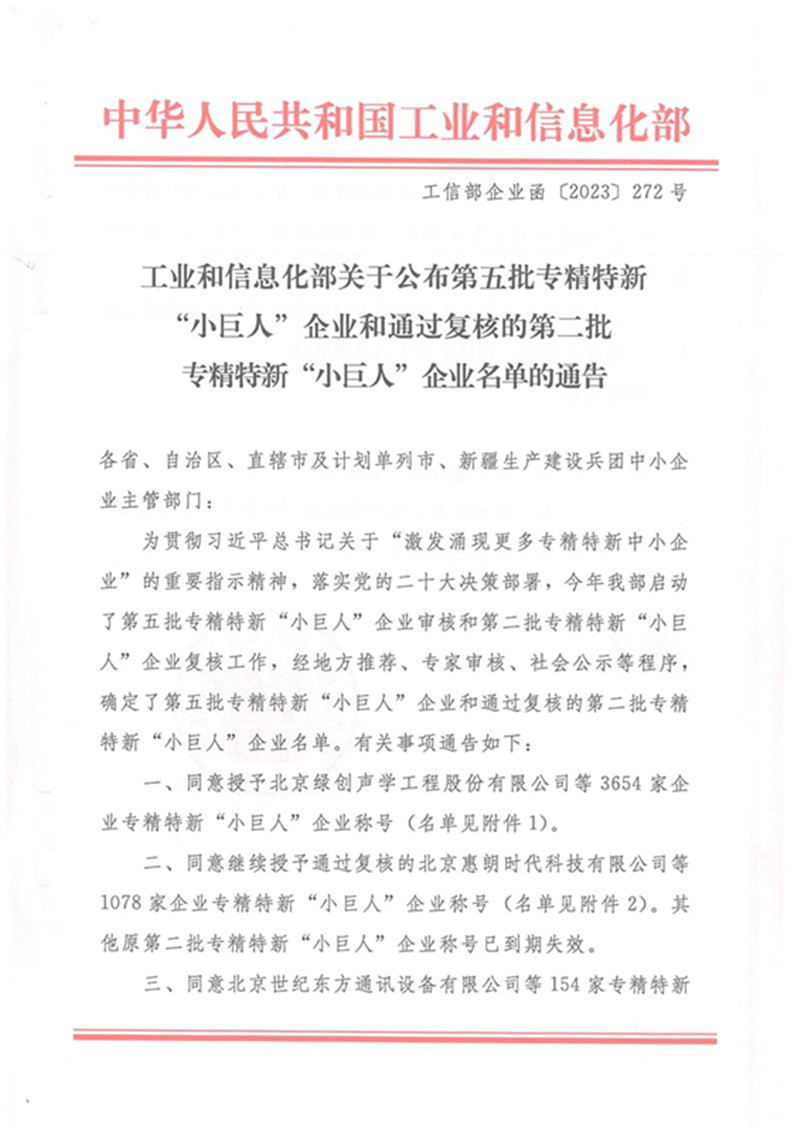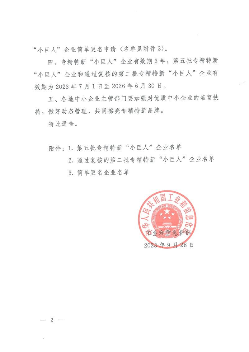為貫徹習近平總書記關于“激發(fā)涌現更多專精特新中小企業(yè)”的重要指示精神,落實黨的二十大決策部署,工業(yè)和信息化部啟動了第五批專精特新“小巨人”企業(yè)審核的工作,我公司榮獲第五批專精特新“小巨人”稱號。